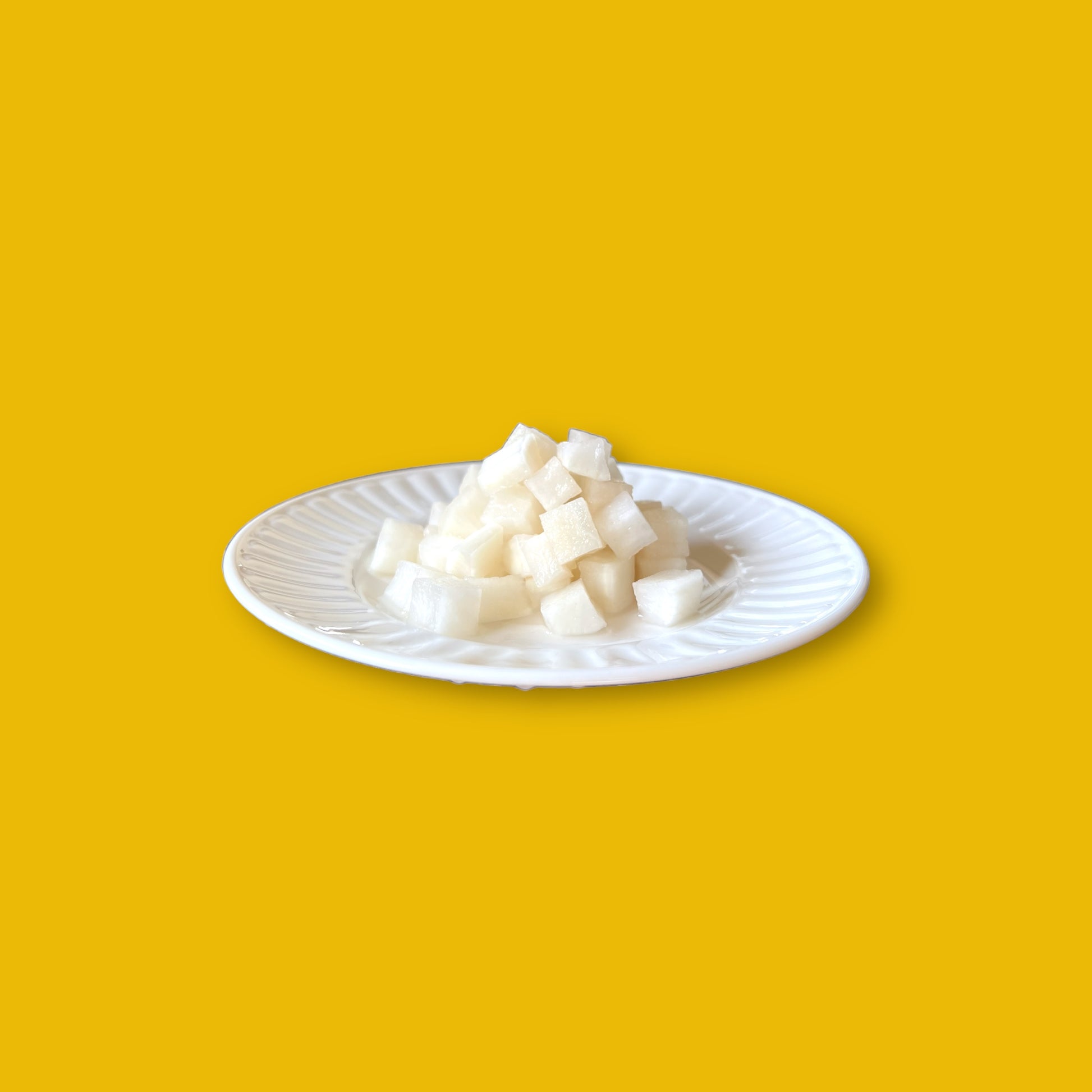 Experience the vibrant and refreshing delight of Mu, a traditional Korean pickled radish side dish. With its crisp texture, tangy flavor, and subtle sweetness, Mu perfectly complements fried chicken, providing a zesty and refreshing contrast that elevates every bite.